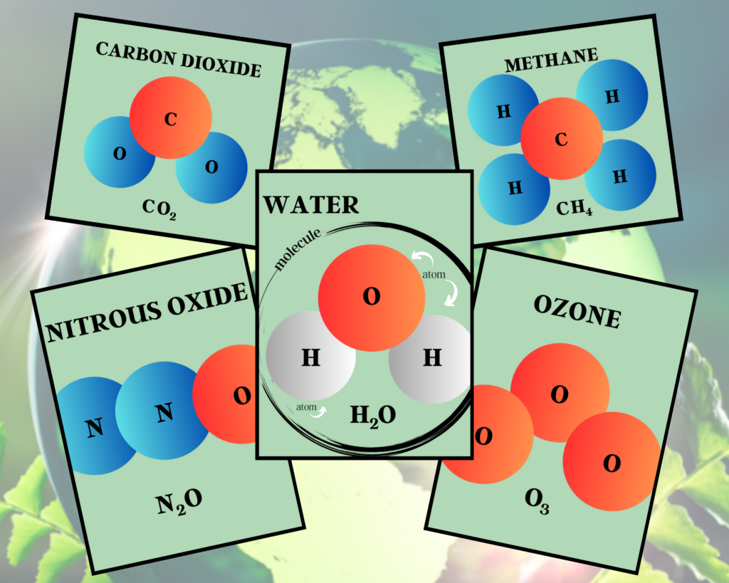 The greenhouse effect is the atmosphere surrounding the earth that protects all living things as it shields us from the sun’s rays. It also insulates the earth, retaining the heat of the day throughout the night. This is the greenhouse effect. Sun light is shortwave solar radiation that passes through this atmosphere. The earth absorbs this energy, heats up, and radiates it in the form of longwave infrared radiation. Greenhouse gases in the air absorb this energy and radiate it up into space and onto earth which warms Earth. The major greenhouse gases are water vapor, carbon dioxide, methane, nitrous oxide, and ozone. These gases are molecules made of atoms. Their molecular structures are as follows: